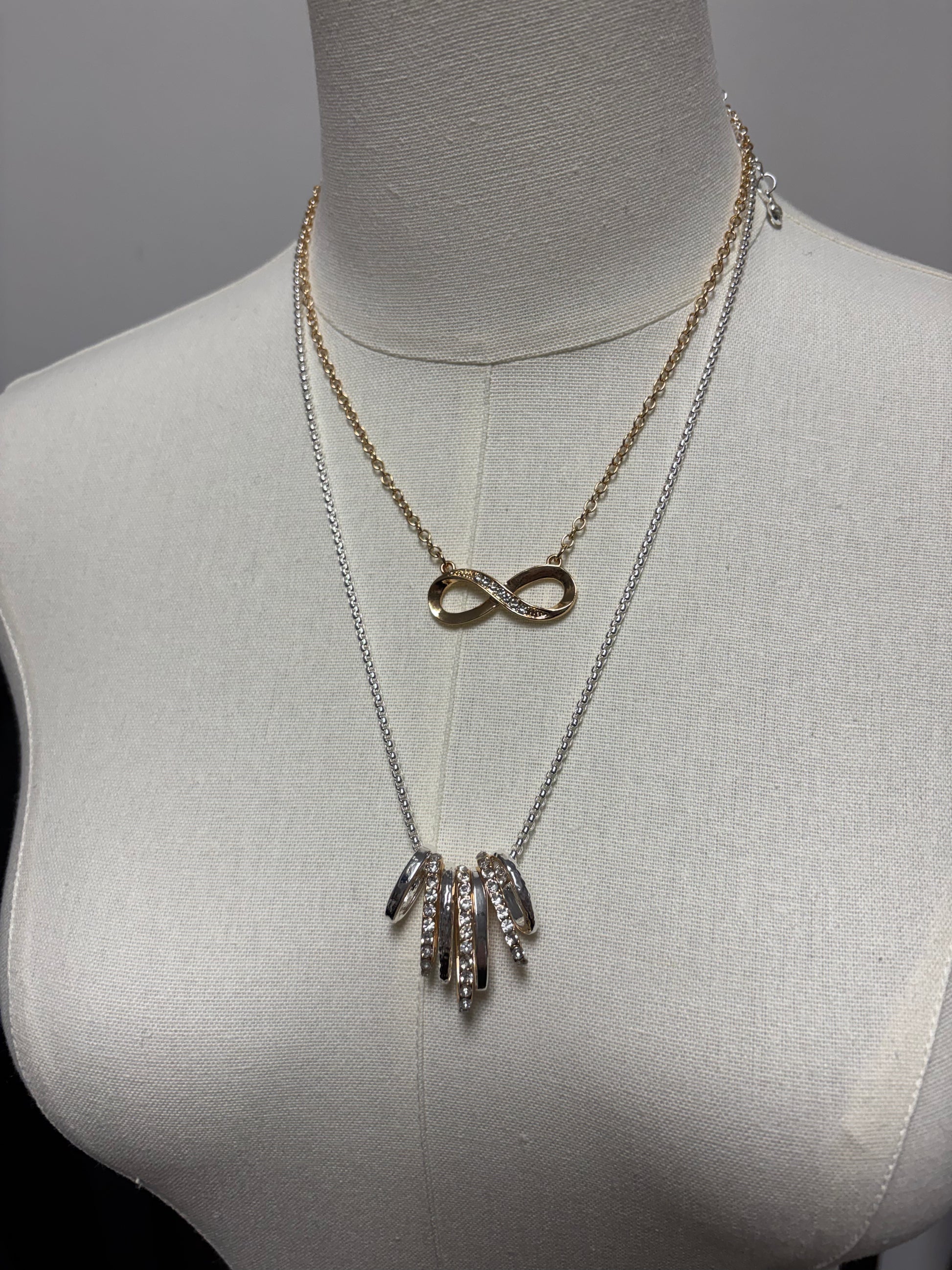 The set gives you two detachable layers: a gold infinity necklace that sits higher and a longer silver strand finished with mixed metal oval rings and crystals. Wear them together for a modern, high-low moment, split them up for everyday versatility, or stack them with your own pieces to build a look that feels personal.