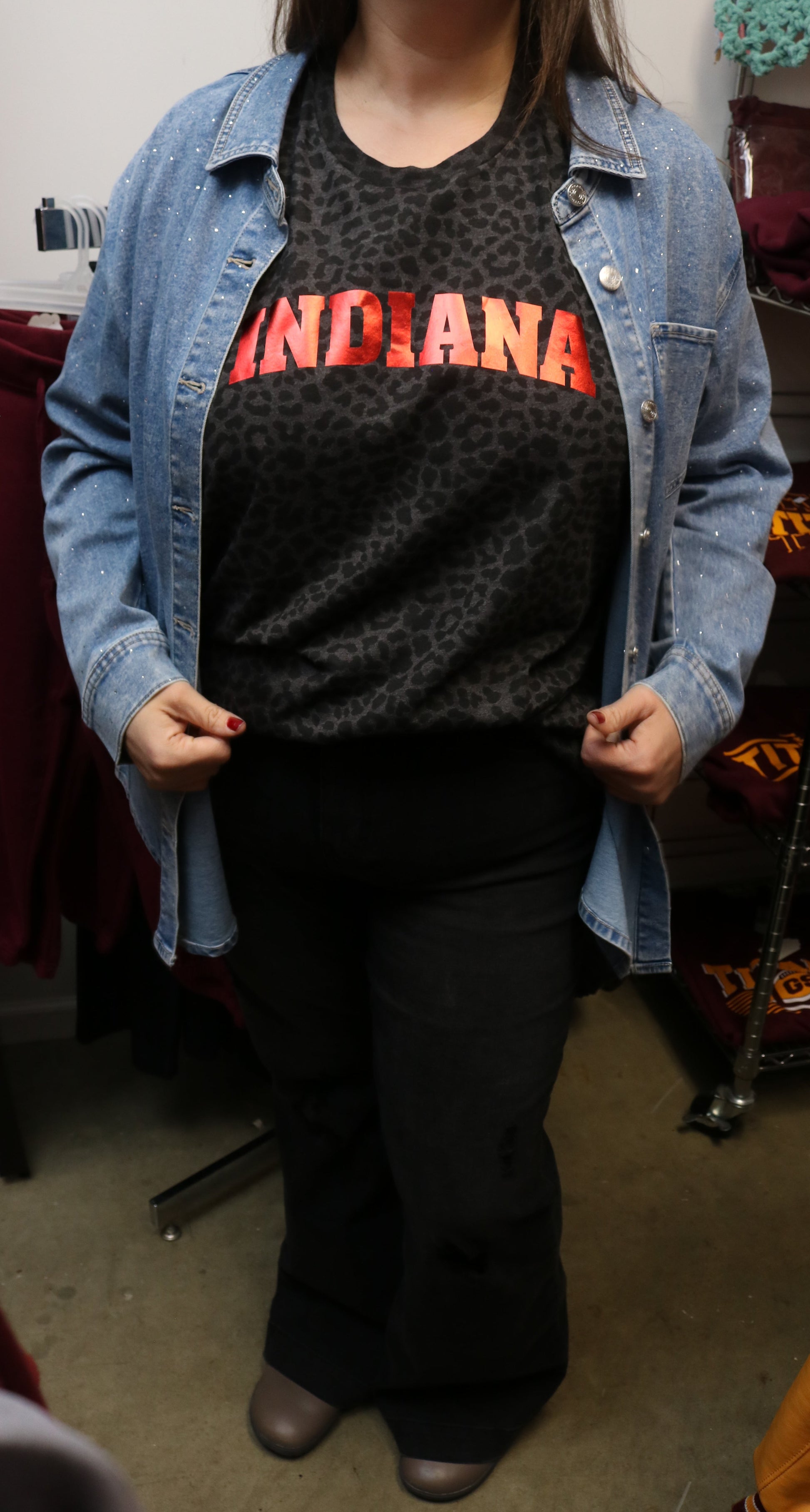 Indiana in red metallic on black leopard t-shirt